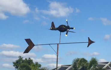 This custom airplane kinetic directional windvane is fashioned from a discarded washing machine drum. The AA stands for Action Appliance and flies in front of their store in Port Charlotte, Florida.