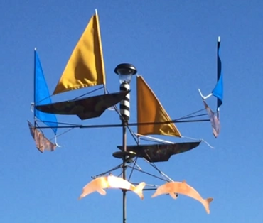 Sails turn and tack into the wind, driving the mechanisms that move the figures and sculptures mounted on the wind vane.